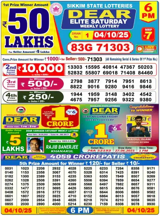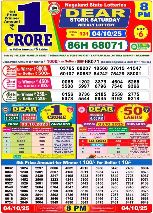 Lottery Sambad Evening Result 8:00 PM 4.10.2025. You can find the Lottery Sambad Night result 4.10.2025. Nagaland State Lotteries 4.10.2025 Lottery Sambad Today Day Result at 8PM.  Dear Evening Results.